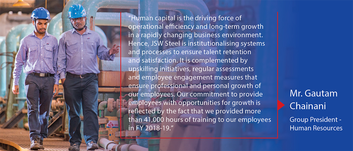 In FY 2018-19, the main insights for the Company’s learning needs came from JSW Steel’s Performance Management System, Future Fit Assessment and the Great Place to Work survey. Based on their analysis, the Company launched systematic learning interventions for every grade, focussing on the next role capability building and enhancement of leadership and functional skills.