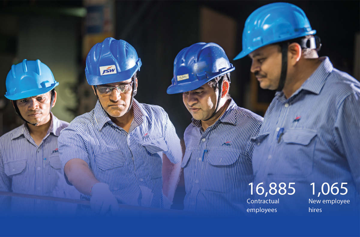 JSW Steel acknowledges this and constantly engages with individuals from multiple locations to explore their full potential and prepare them for leadership roles. The Company’s constant efforts have created an inclusive culture that does not discriminate on the basis of religion, gender, caste or disabilities and has a policy for equal opportunity for all. Besides equal employment, the workforce (including contractual workers and those with disabilities) is entitled to equal benefits, training and skill enhancement.