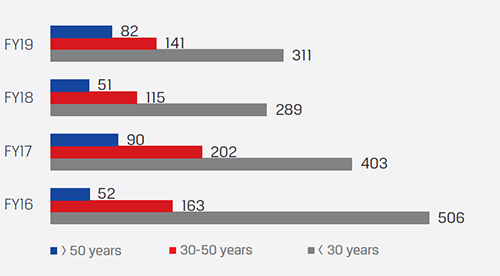 | Employees at sites (segmented by age) | FY 2018-19 |